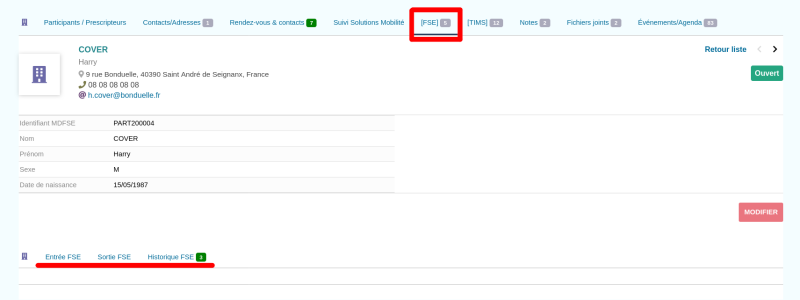 En dessous, vous trouverez les liens cliquables vers les 3 onglets FSE : Entrée FSE / Sortie FSE / Historique FSE