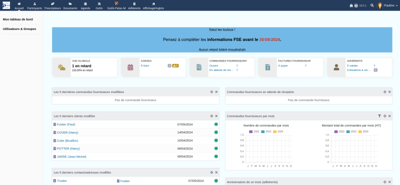 Une fois connecté, vous arrivez sur le tableau de bord ci-dessus, qui présente quelques indicateurs et raccourcis. Chacun peut le personnaliser comme il le souhaite.