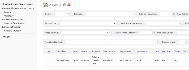On accède au module Analyse via le menu gauche du module Bénéficiaires / Prescripteurs en cliquant sur le menu “Analyse”